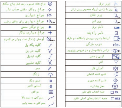 در نقشه ها هر وسيله يا عنصر برقى با يك نشانه يا علامت اختصارى نشان داده مىشود. براى اين كه در خواندن نقشه ها تفسيرها و تعبيرهاى متفاوتى نسبت به يك وسيلة برقى وجود نداشته باشد، بايد كلية علايم از يك استاندارد پيروى كنند تا به اين ترتيب زبانى مشترك در بين ترسيم كنندگان و كسانى كه نقشــه ها را مىخوانند وجود داشته باشد. به اين منظور در رشتة برق استانداردى توسط كميتة بين المللى الكتروتكنيك1تهيه شده اســت كه همة علايم ترسيمى بايد با آن استاندارد